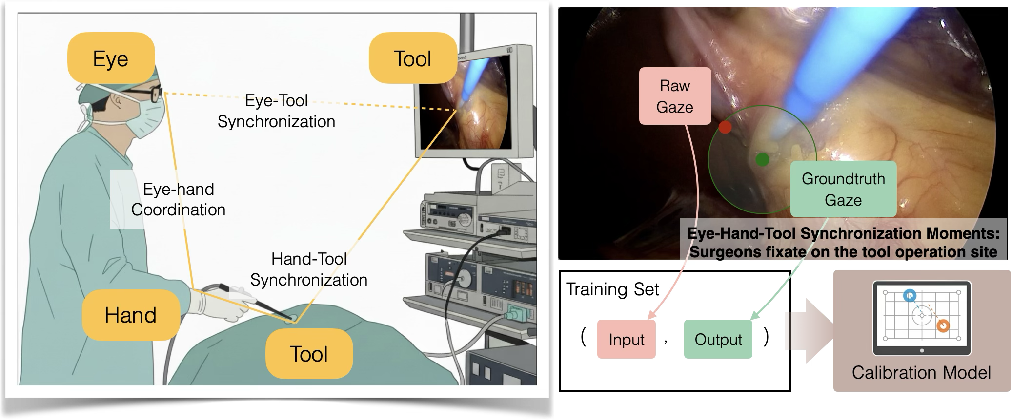 SurgGaze is an implicit calibration method that uses tool–tissue interactions as natural cues to improve surgeons’ gaze tracking. It reduces gaze error by 40.6% compared to standard calibration, enabling more reliable attention analysis in both simulated and real operating rooms. (Paper Under Review)